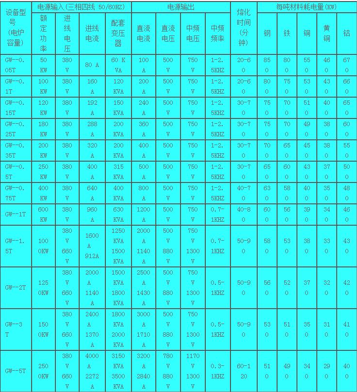 功率参数以熔炼钢铁为准;熔炼铜.铝.锌等熔点低的材料则功率要求相应偏小,具体数据请致电恒扬技术部咨询;
