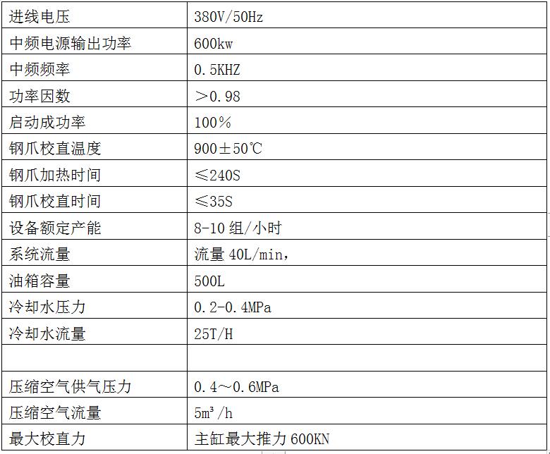 3.2工作原理:该设备为自动在链阳极钢爪校直机,可以实现阳极钢爪的在链连续校直,通过专用中频感应加热,专用液压装置进行校直。加热方式:电磁感应式。 校直方式:液压双推式。该套校直机设备设有一个加热工位、一个校直工位。 通过组合实现: 每次加热、校直一组钢爪外侧的四个爪头; 钢爪在此工位纵向(平行于钢爪长度方向)进入加热、校直设备。