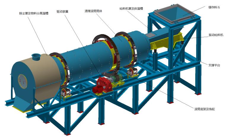 8.2工作原理:磷铁环压脱下来的破碎磷铁在滚筒内通过相互碰撞摩擦,去除其表面杂质,使清理出来的杂质和清理干净的磷铁环分离。